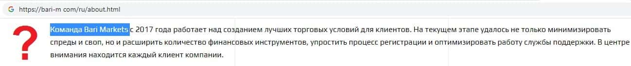 Информации о руководстве скам-проекта БАРИ Маркетс на их официальном сайте не найдено, потому что контора липовая, мошенники предпочитают анонимность.