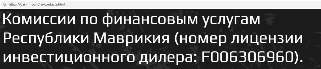 На официальном интернет-портале комиссии по финансовым услугам республики Маврикий fscmauritius org отсутствуют данные о лицензии компании БАРИ Маркетс.
