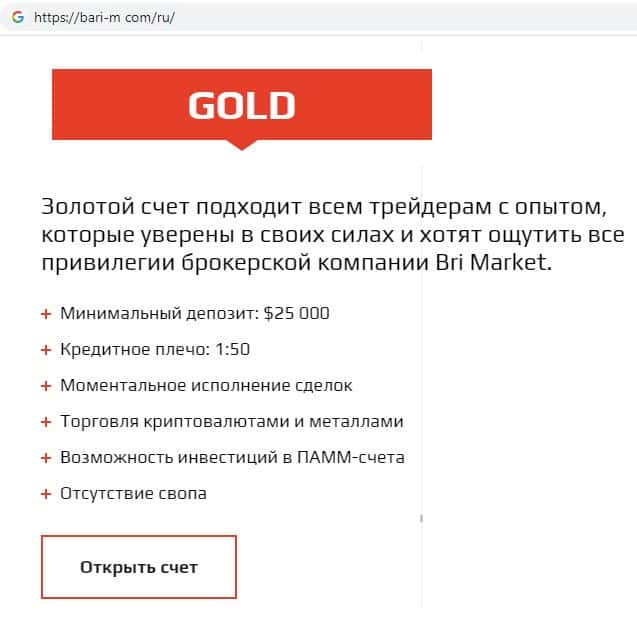 Также псевдо-брокер BARI Markets предлагает открыть торговый счет под названием Gold, где минимальный депозит также является подтверждение того, что перед нами Форекс-кухня.