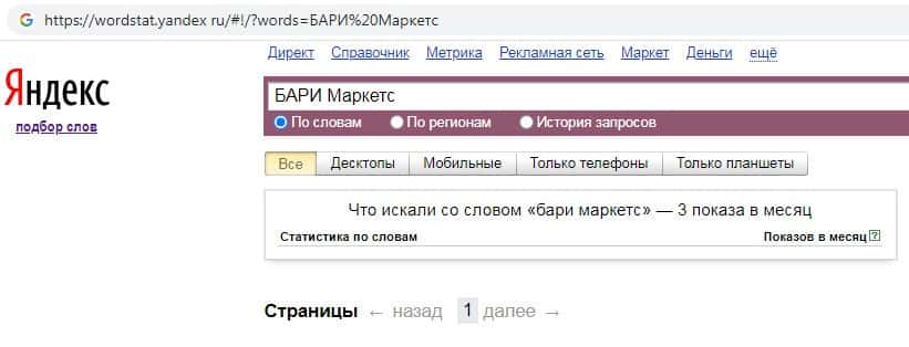- Количество запросов по бренду БАРИ Маркетс в поисковике Yandex