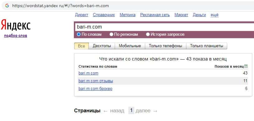 Количество брендовых запросов название домена компании "bari-m.com" на Яндекс Вордстарт составляет 43 запроса за месяц.