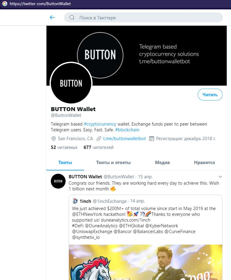 Имеется у аферистов Баттон Валет страница в социальной сети Twitter, где у шулеров ButtonWallet размещена довольно стандартная и типичная лапша на уши и имеется всего несколько сотен подписчиков. На изображении, расположенном ниже, вы можете наглядно увидеть страницу аферистов Баттон Валет в социальной сети Твиттер.