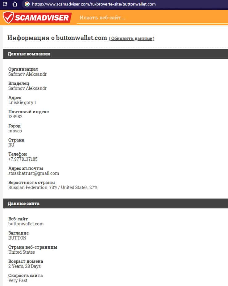 В связи с мошеннической и противозаконной деятельностью лохотрона Баттон Валлет его реальные руководители предпочитают анонимность дабы избежать ответственности со стороны правоохранительных органов. Техническую же информацию о сайте жулья ButtonWallet можно узнать с помощью портала scamadviser com, что вы можете увидеть ниже.