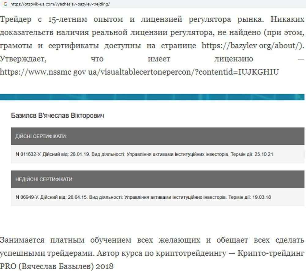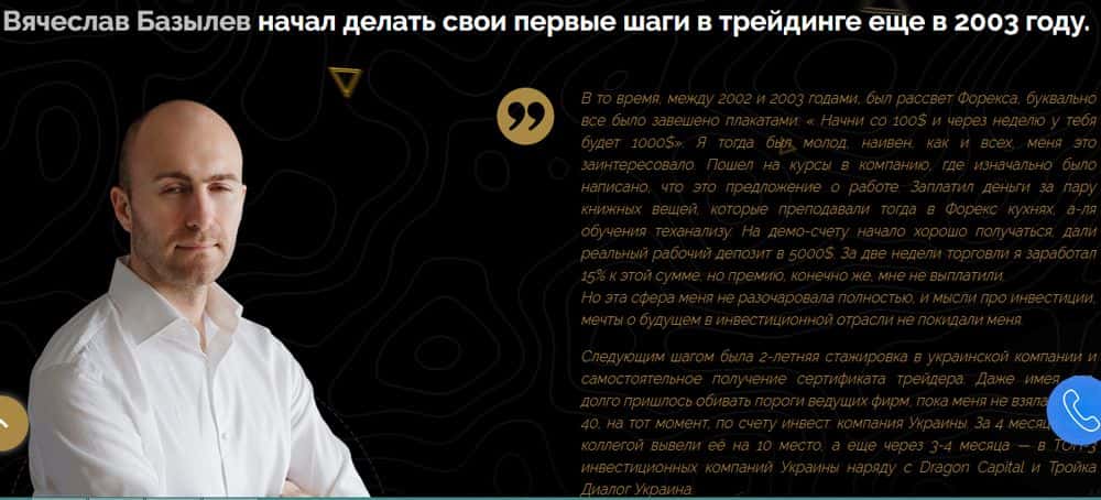 Управляет скам-проектом Bazylev Org некий Базылев Вячеслав Викторович. Он якобы является трейдером с многолетним стажем, который уже давно управляет инвестициями и имеет кучу фанерных наград и дипломов. На самом деле что у него получается, так это толкать свои учебники и сомнительные курсы за бешеные деньги.