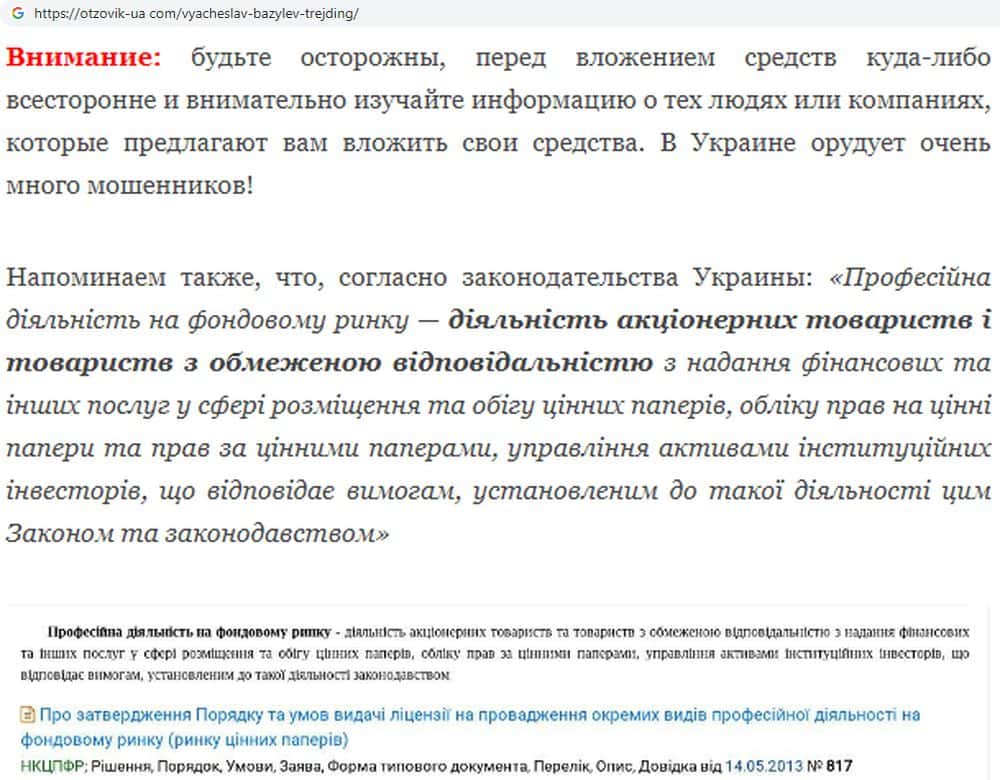 Сайт otzovik-ua com напоминает пользователям, что вести консультационную деятельность или брать счета в доверительное управление компании могут только при наличии соответствующих документов, которые являются страховкой для клиентов. У жуликов Базылев Орг какие-то разрешения есть, но указанных видов деятельности они не касаются.