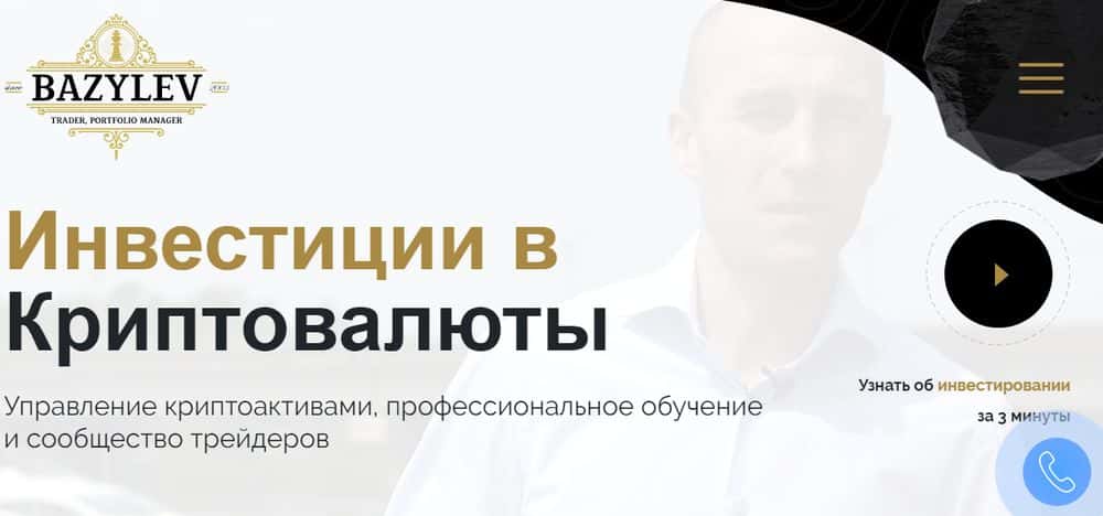 Сайт липовых трейдеров Bazylev Org - обычная ловушка для простодушных новичков. Морду ресурса украшает гламурное фото успешного владельца лохотрона, чтобы внушить жертвам ложное убеждение, что они могут так же. Каталы зазывают новичков инвестировать в криптовалюты, предлагают "крутое"обучение и билет в сообщество трейдеров.
