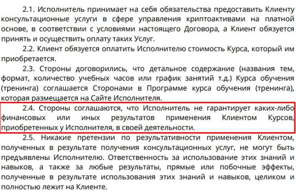 В клиентском соглашении в исполнении пройдох Bazylev Org полно двусмысленных моментов, которые лишний раз подтверждают, что доверять им деньги опасно. Во-первых, финансовые наперсточники Bazylev Org в соглашении не дают никаких гарантий прибыли после прохождения курсов, хотя на сайте расхваливают этот самый курс как волшебную пилюлю.