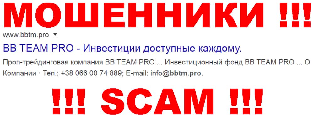 ББ ТМ - очередные мошенники сети интернет, которые занимаются наглым разводом наивных пользователей сети интернет под довольно банальным предлогом инвестиций, в ходе которых жулики BBTEAM PRO оперативно кидают на деньги свою наивную клиентуру и сливаются. В связи с этим сотрудничать с аферистами ББ ТМ не рекомендуем !!!