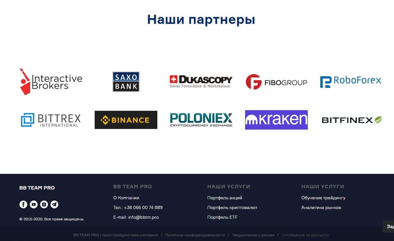 Завершается же подвальный сайт у мошенников BBTEAM PRO довольно стандартно, а именно сомнительным перечнем партнеров аферистов ББ ТМ, а так же ссылками на различные страницы подвального сайта сайта аферистов BBTEAM PRO. На изображении, расположенном ниже, вы можете наглядно увидеть окончание подвального сайта мошенников.
