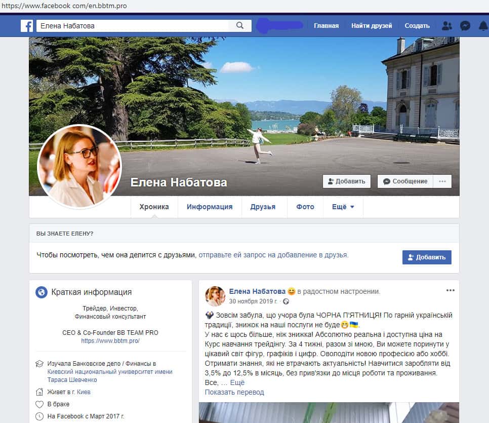 Дабы соответствовать всем современным трендам шулера ББ ТМ решили обзавестись страницами в социальных сетях одной из которых ожидаемо является Facebook. Ссылка, размещенная на сайте мошенников BBTEAM PRO ведет да страницу, которую вы можете наглядно увидеть на изображении, расположенном ниже.