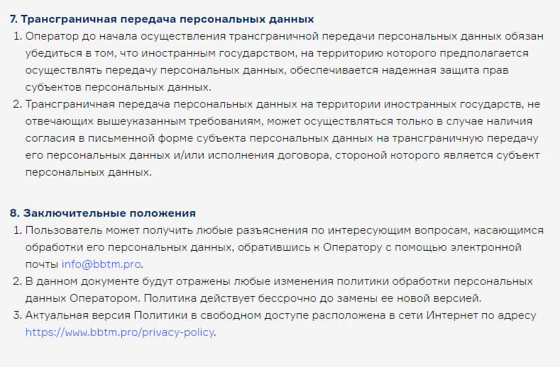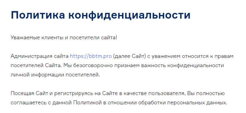 После на сайте у мошенников ББ ТМ следует "вода" о том, какую информацию пользователей собирают аферисты BBTEAM PRO. Данная информация не несет в себе никакой информационной нагрузки и расположена исключительно для виду. На изображении, расположенном ниже, вы можете увидеть данный раздел политики.