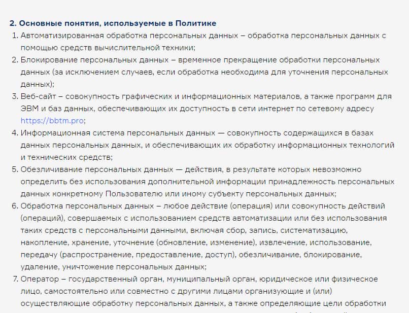 Далее в политике конфиденциальности аферистов ББ ТМ следует довольно сомнительный раздел, в котором мошенники BBTEAM PRO перечисляют перечень понятий. Данный раздел не несет в себе никакой информационной нагрузки и расположен проходимцами ББ ТМ для увеличения размера документа, что вы можете увидеть ниже.