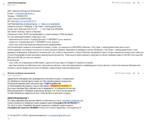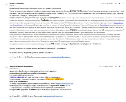 Письмо пришло от человека, который влез в несколько интернет-лохотронов, при чем такое ощущение, что это одна и та же контора. Среди них были такие кухни: ББрокер, Деллой Трейд и ТОП Трейд. Мошенникам удалось вытянуть на сумму свыше 8000 долларов и , чтобы вернуть деньги, нужно написать все подробности в ChargeBack.Me