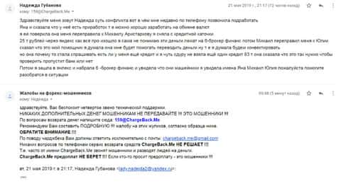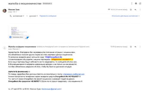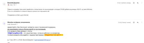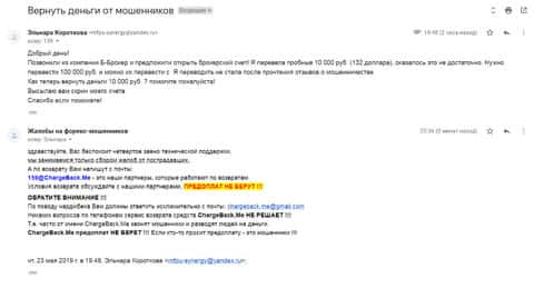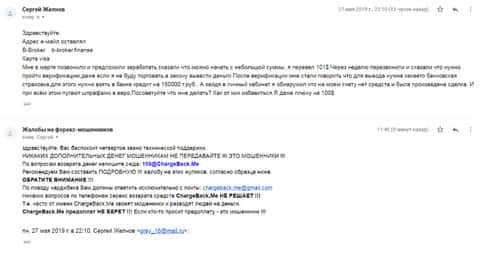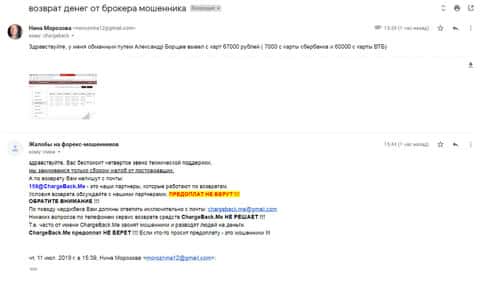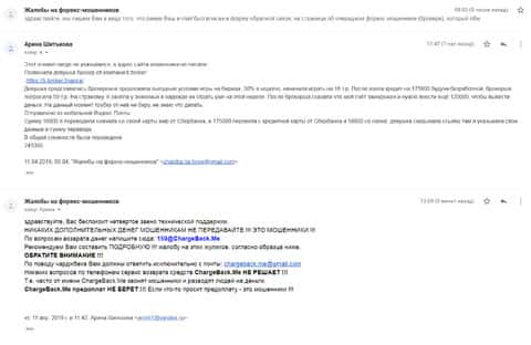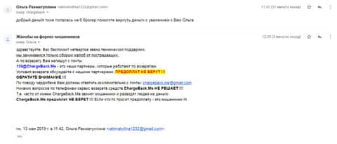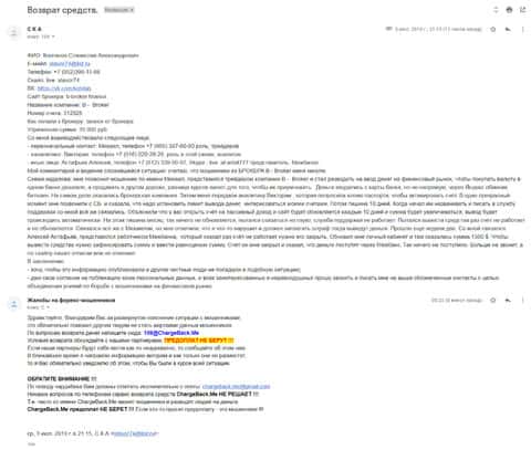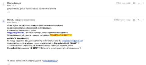 Ниже представлен скрин письма с жалобой, которая пришла на е-майл веб-площадки по сбору сведений о мошенничестве на рынке Форекс. Пострадавшему клиенту нескольких жульнических интернет-площадок порекомендовали обратится в специализированный интернет-сервис ChargeBack.Me за помощью.