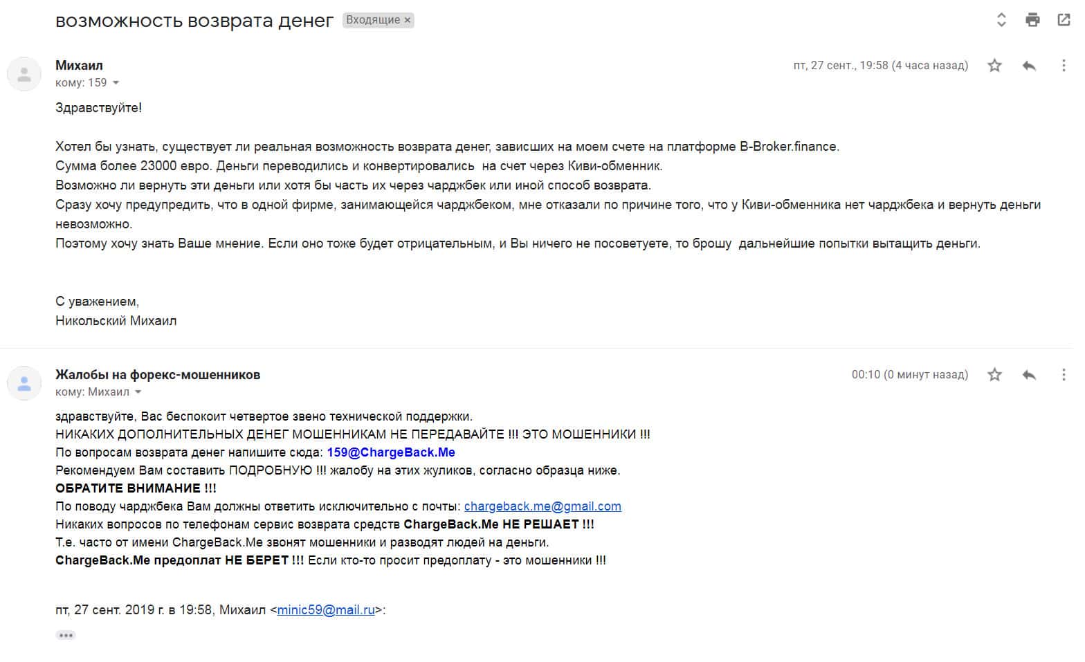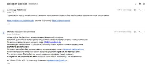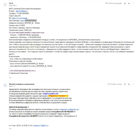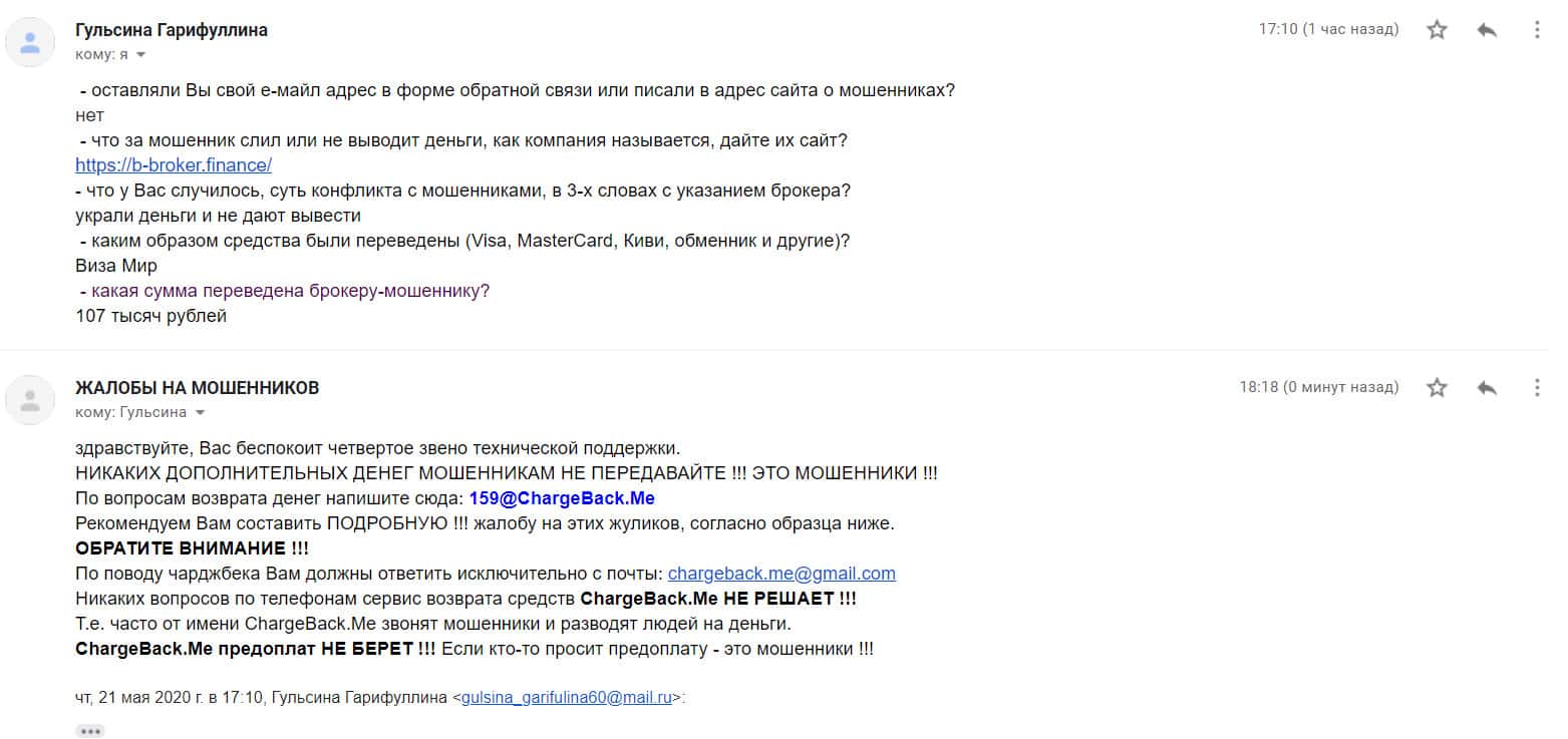 Для того, чтобы попытаться возвратить свои утраченные деньги, пострадавшему клиенту брокерской кухни Б Брокер посоветовали обращаться в специализированную службу ChargeBack.Me которая помогает людям, которые потеряли свои вложения из-зам мошенников Форекс.