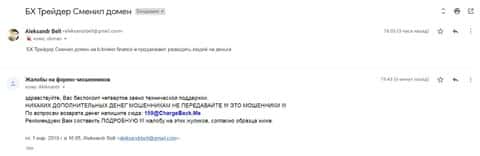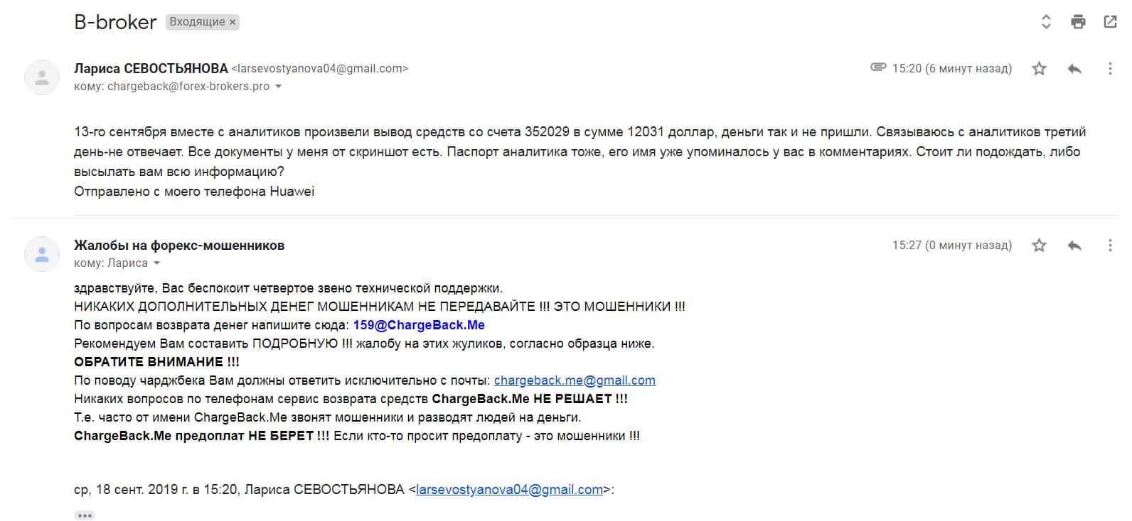 Далее представлено письмо, в котором человек прикрепил все детали развода со стороны шулеров форекс-лохотрона B-Broker.