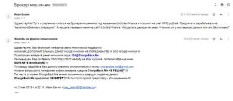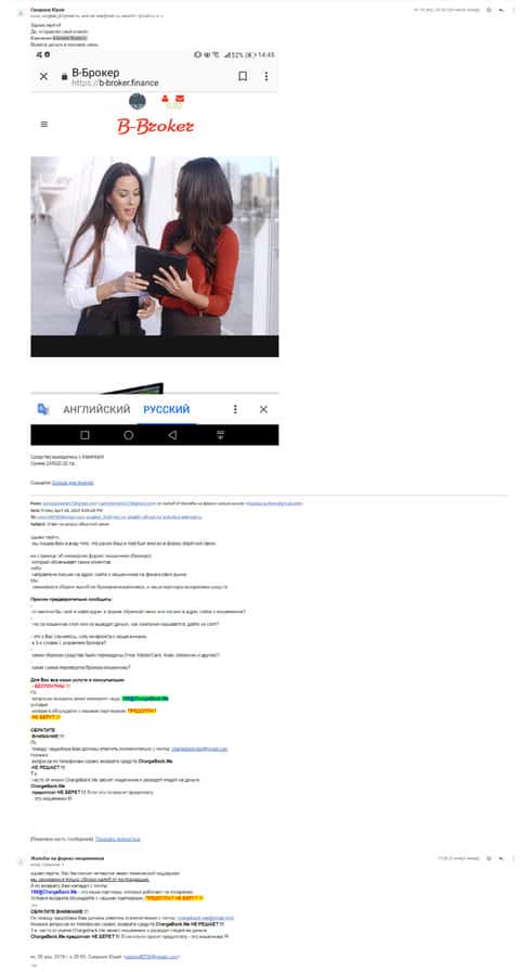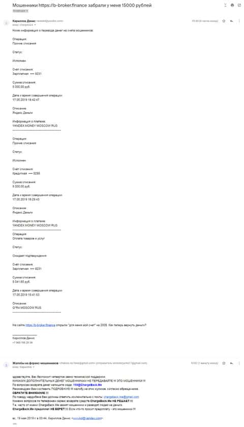 Очередной пользователь сети Интернет, который пострадал от рук аферистов Б-Брокер, написал жалобу на данный лохотрон Форекс. Для того, чтобы попробовать вернуть свои вложенные средства, человеку для начала необходимо написать в службу ChargeBack.Me где возможно ему помогут.