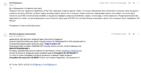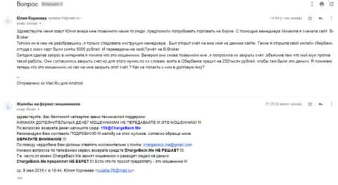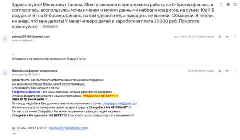 Очередная жертва прислала письмо с подробностями о мошеннической кухни B-Broker, а именно о ее шулерских схемах. Брокер втерся к ней в доверие и таким образом удалось выманить у клиентки около 185 000 рублей. Знакомая посоветовала ей обратиться в службу ChargeBack.Me за помощью в возврате средств.