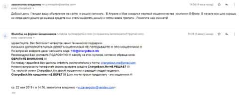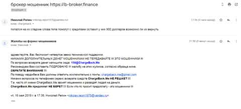Далее можно ознакомится с жалобой на аферистов Б-Брокер, в которой пострадавший клиент данной шарашкиной конторы не указал суммы. Также в ответ на письмо с жалобой ему была выслана рекомендации по поводу обращения в сервис ChargeBack.Me где возможно человеку помогут.