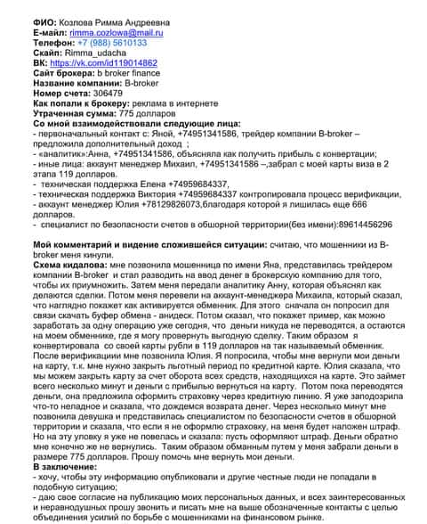 - Детальная жалоба на мошенников B-Broker от клиентки, утратившей почти 800$