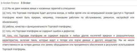Далее перейдём непосредственно к Пользовательскому Соглашению. Тут аферисты B-Broker разместили зацепки, благодаря которым могут по разному торбить клиента, а за это будет нести ответственность сам клиент. Вот, например, сотрудничество с данными жуликами грозит вам как потерей денег, так и возможностью порчи имущества и кражи персональных данных, так что сотрудничество с ББрокер опасно действительно во всех смыслах.
