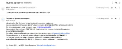 Один человек прислал письмо с возмущением, так как кухня ББС Форекс занимается обманом, мошенничеством и воровством по отношению к своим клиентам, а на них никак не могут найти управы. Жулики теперь будут иметь дело с ребятами из компании ChargeBack.Me иначе никак своих денег оттуда не вернешь.