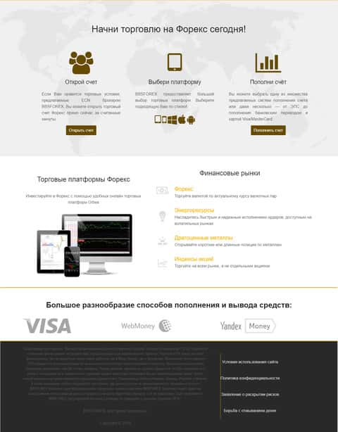 Теперь перейдём к сайту аферистов BBSForex. Он оформлен традиционно для всех псевдо трейдерских контор. Мошенники ББС Форекс не упускают шанса рассказать о том, какие преимущества у их конторы перед другими и какую прибыль здесь можно получить. Увы, это всё ложь.