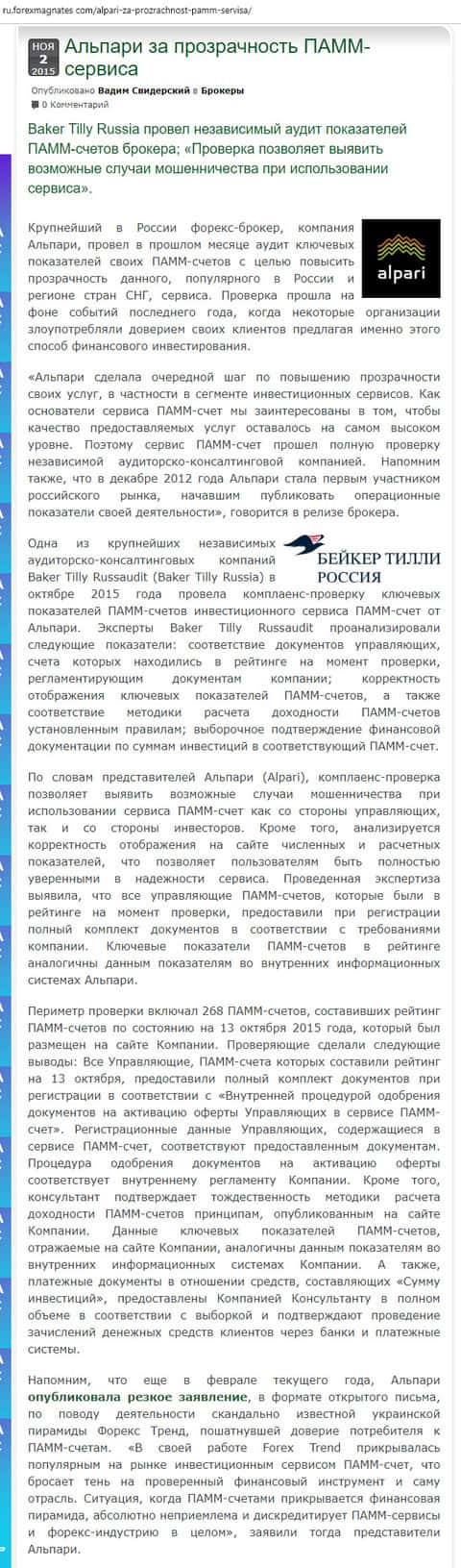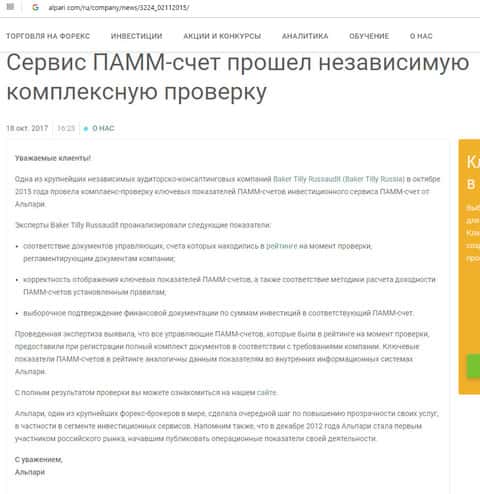 Далее представлена еще одна статья, которая показывает, что мошенники Альпари очень довольны независимом аудите, от конторы Baker Tilly, показателей ПАММ-счетов. Таким образом мошенники подняли репутацию шаражников от Альпари и те естественно получили свой откат. Мы то знаем как работают ПАММ-счета от Альпари и к чему они приводят своих участников.