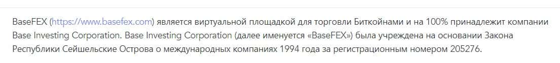 В договоре компании BaseFEX Com есть информации, что управляющая данным сайтом организация находится на Сейшельских островах и зарегистрирована там.