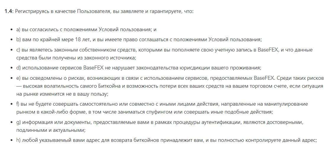 В пункте 1.4 контора BaseFEX Com говорит о том, что пользователь обязан предоставлять достоверную личную информацию о себе.