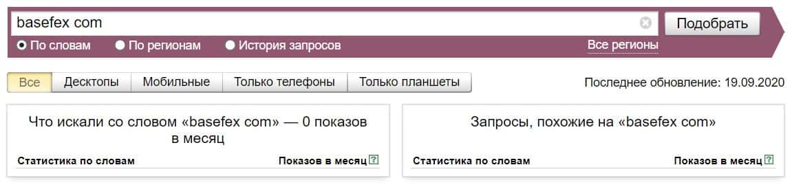 Количество запросов в поисковике Яндекс по доменному имени "basefex com" без точки, не отличается от предыдущего: 0 показов.