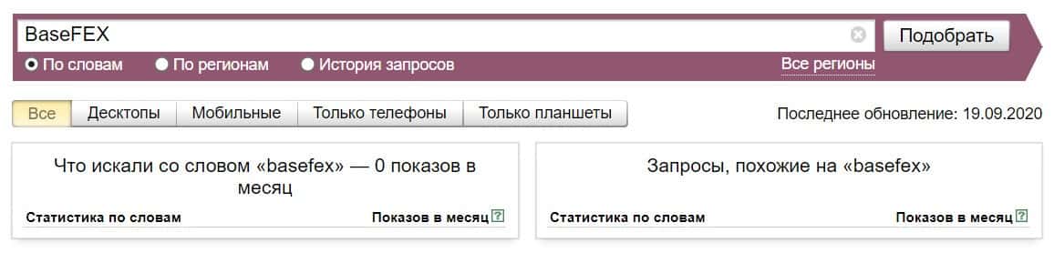 Название мошеннической конторы "BaseFEX", написанное на английском языке, пользователи не искали в системе Яндекс.