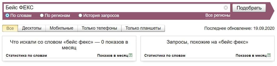 Посмотрим, сколько раз люди искали название бренда "Бейс ФЕКС" на русском языке с пробелом: 0 раз за месяц.