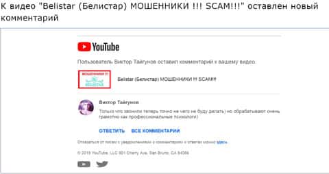 Под видео-роликом на канале видеохостинга Ютуб о мошенниках Форекс Белистар оставлен комментарий от человека, которого пытались втянуть в данный интернет-лохотрон. Так как человек сообщил о том, что ему звонили эти жулики и профессионально обрабатывали.