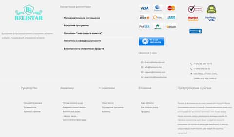 Завершается сайт жуликов Белистар типичным меню с расположенным под ним отказом от ответственности, в котором аферисты Belistar оперативно сливаются от всего ими вышесказанного. На изображении ниже вы можете увидеть данный раздел сайта мошенников.