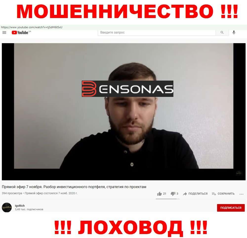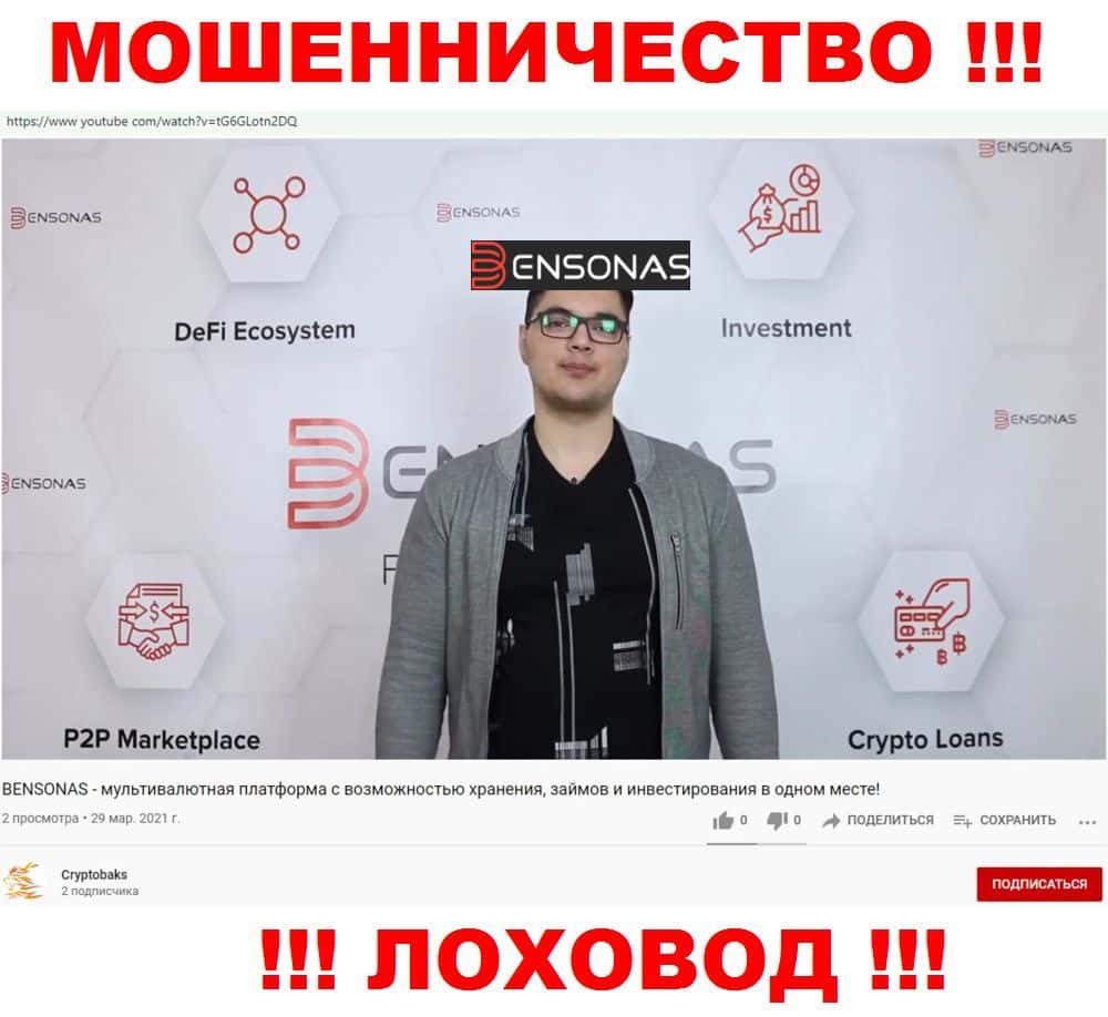 Поехали дальше. Еще один лоховод, который пиарит шарагу Bensonas. Этот персонаж уже давно продвигает проекты, которые заставляют всех доверчивых пользователей дарить деньги.