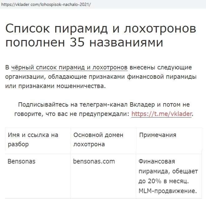 Шарлатаны Бенсонас уже успели попасть в черные списки финансовых пирамид, хотя они и начали свою деятельность совсем недавно. Проблема в том, что этот хайп вообще не платит.