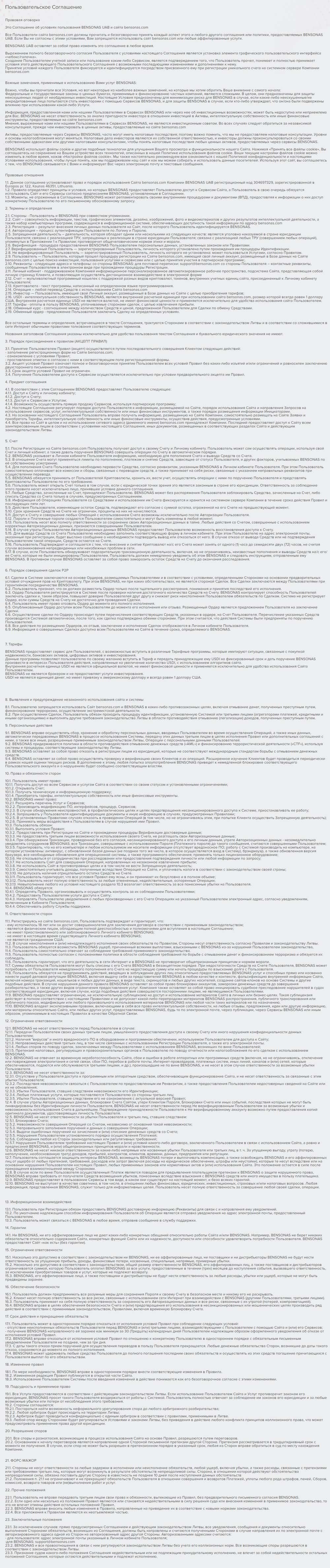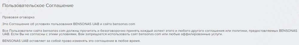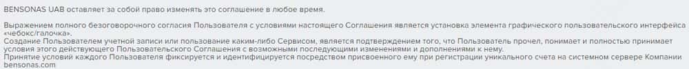 Ниже приведен полный текст мошеннического договора кидал Бенсонас. При регистрации жертва автоматически соглашается с этим сомнительным документом и оказывается в ловушке.