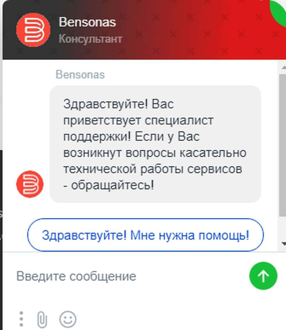 Для связи с людьми на сайте разводил Бенсонас якобы есть живой чат. Но, как показывает практика, это один из самых ненадежных способов связи. Мошенники просто игнорируют жертв.