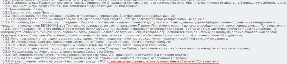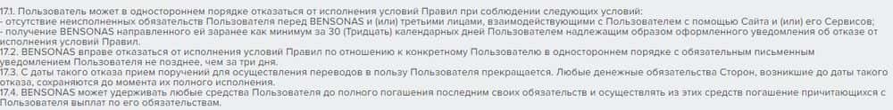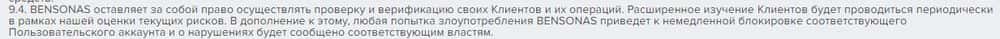 У мошенников Бенсонас в клиентском соглашении уесть куча невнятных правил, за каждое из которых они могут заблокировать аккаунт, и при этом оставить деньги пострадавшего себе.