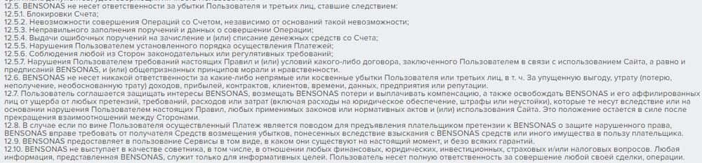 Далее разводилы Бенсонас указывают, что они не собираются нести ответственность за любые убытки клиентов. То есть, они фактически признаются, что их цель - отобрать их деньги.