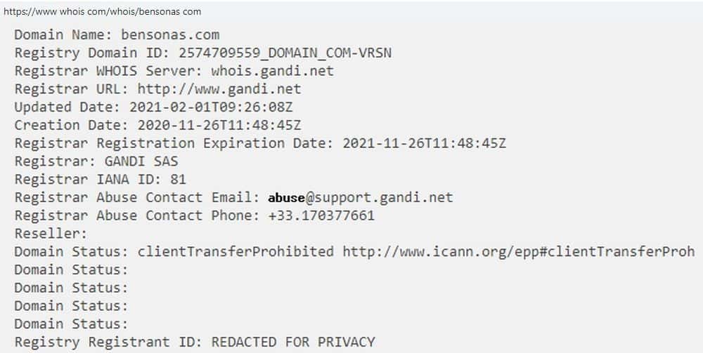 Онлайн-сервис скамэдвайзер ком предупреждает, что с кидалами Бенсонас лучше не иметь дел: они используют платные сервисы, чтобы скрыть данные владельцев, сайт создан недавно.