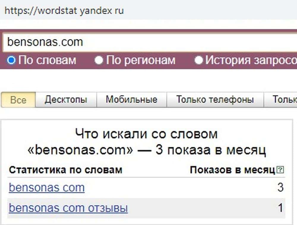 Дешевый хайп Бенсонас вообще мало интересует пользователей сети, несмотря на все усилия лоховодов. По запросу "bensonas.com" всего 3 показа за месяц, и люди искали отзывы.