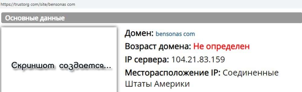 По данным интернет-ресурса трасторг ком видно, что веб-шарага Бенсонас только начала свою мошенническую деятельность. Сайт создан совсем недавно, и кидалы могут испариться.