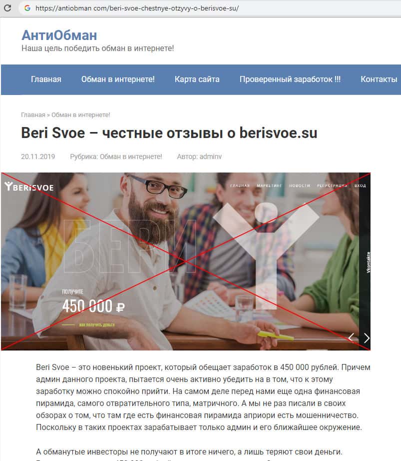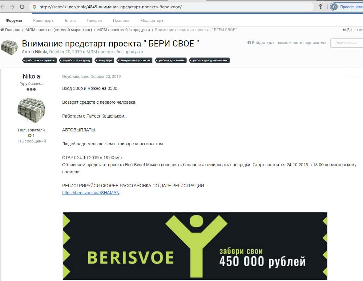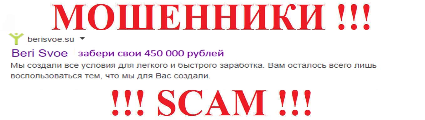 Вердикт портала seoseed ru правдив и строг: "Beri Svoe – это мошенничество. Никакого легкого заработка, тем более, 450 000 рублей, не существует. Данный проект является обычной финансовой пирамидой матричного типа. А матрица – априори нерабочая схема. Не связывайтесь, обман."