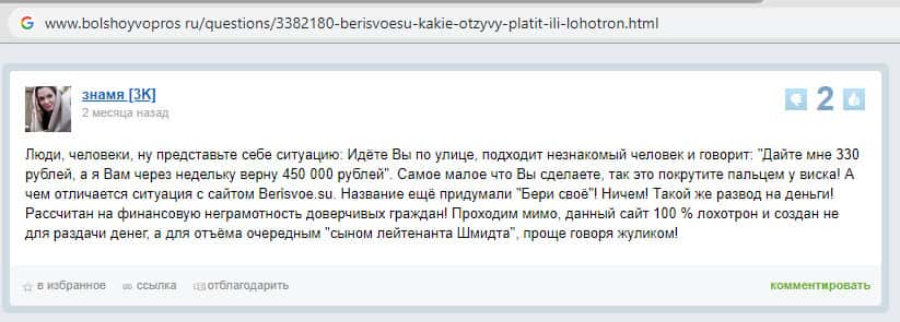 Предупреждение о проекте БериСвоё и подобных в отзыве пользователя gr0m0va на портале bolshoyvopros ru