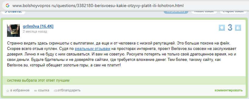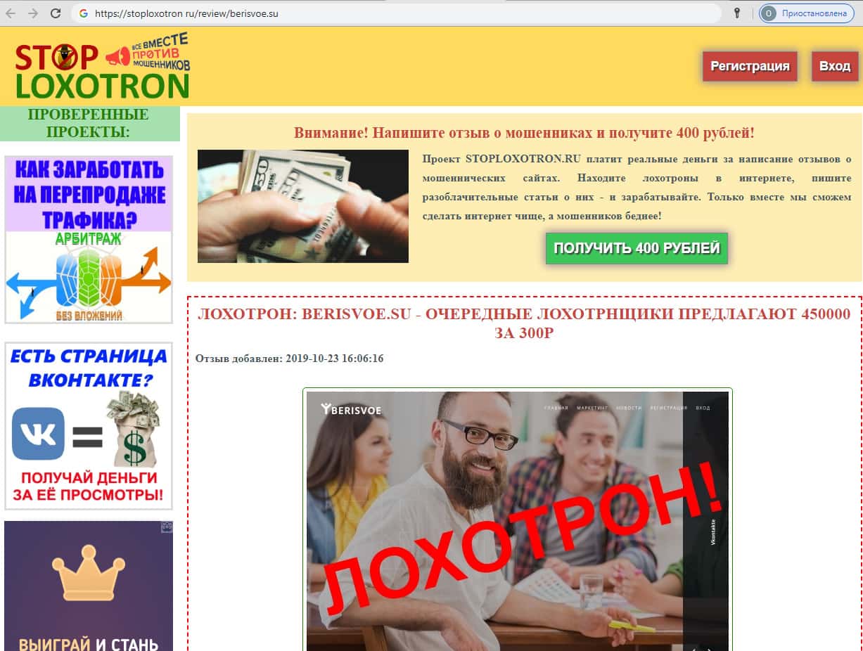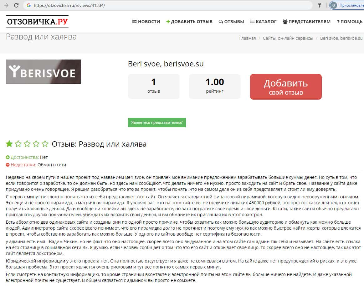 Автор отзыва с наименованием "Лохотрон: BERISVOE.SU" на портале stoploxotron ru рассказал о своем сотрудничестве с проектом БериСвое. Вопреки обещаниям вознаградить автора 450 тысячами рублей проект БериСвое молча присвоил 300 рублей, и притворился, что первый раз слышит о его инвестициях.