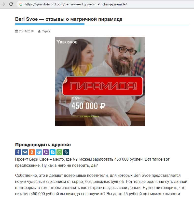 Рассказывает о истинной сути проекта БериСвоё су и портал guardofword com. Автор статьи "Beri Svoe - отзывы о матричной пирамиде" рекомендует всем пользователям воздержаться от инвестирования в данный проект, предупреждает, что о никаком выводе с данной площадки и речи не может быть по сути, ни о сорока пяти рублях, ни тем более о четырехсот тысячах.