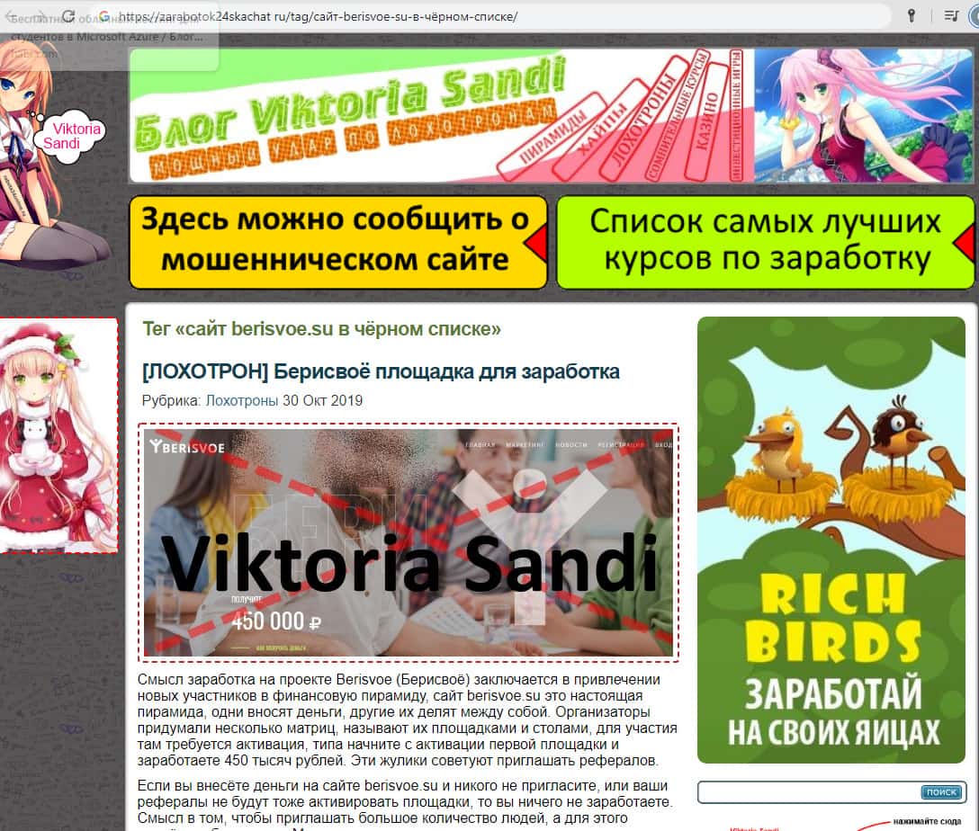 - Разоблачение сути мошеннического проекта БериСвоё на блоге Виктории Санди