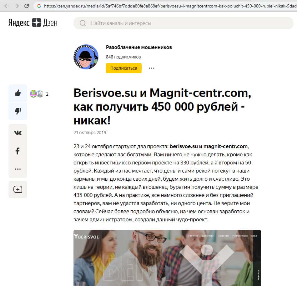 Портал Яндекс Дзен ещё до начала старта проекта БериСвое су предупреждал всех пользователей о том, что это творение представляет собой матричный лохотрон и не то, что четырехсот пятидесяти тысяч рублей, но и копейки на нем заработать никому, кроме администрации не удастся.